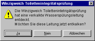 Sicher will ich das. Ich bestätige die Dialogbox mit 'OK' und harre der Ereignisse. Daraufhin gibt mein Stilles Örtchen auf einmal äußerst seltsame, knackende Geräuche von sich. Doch nach Abschluß seiner 'Entkalkungsarbeiten' läuft die Spülung dann